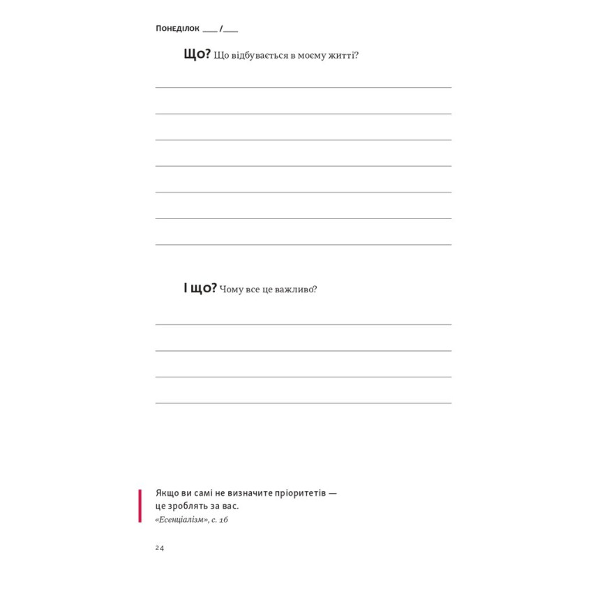 Навіть якщо ви тільки починаєте свій шлях до есенціалізму, планер стане чудовим провідником. Його зручно використовувати як щоденно, так і точково, у моменти, коли потрібно повернути фокус.