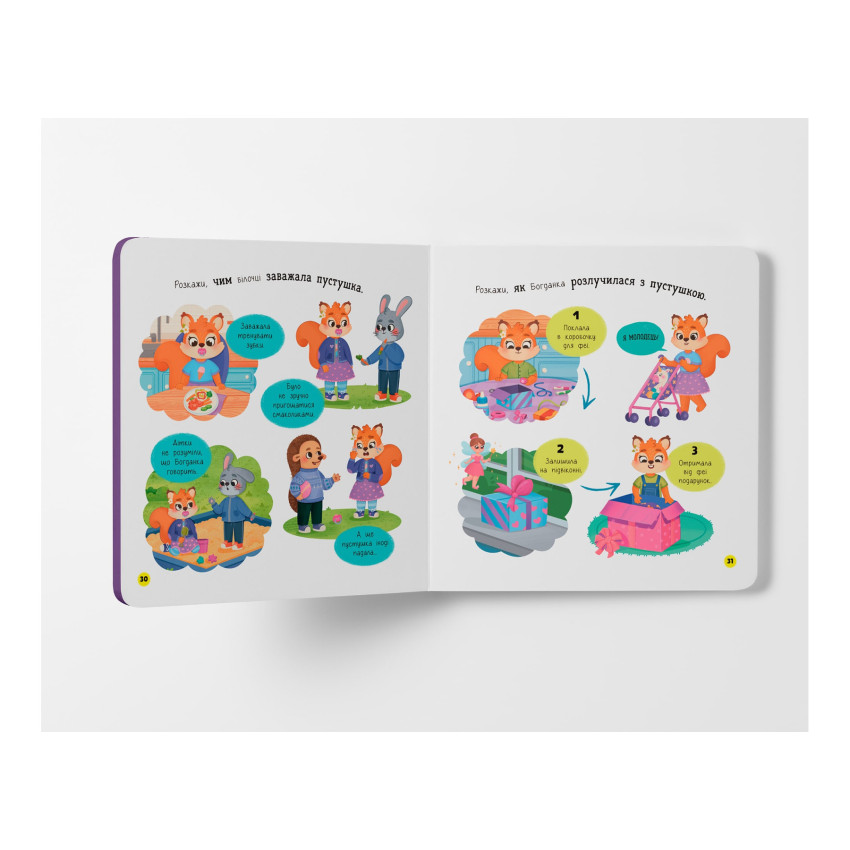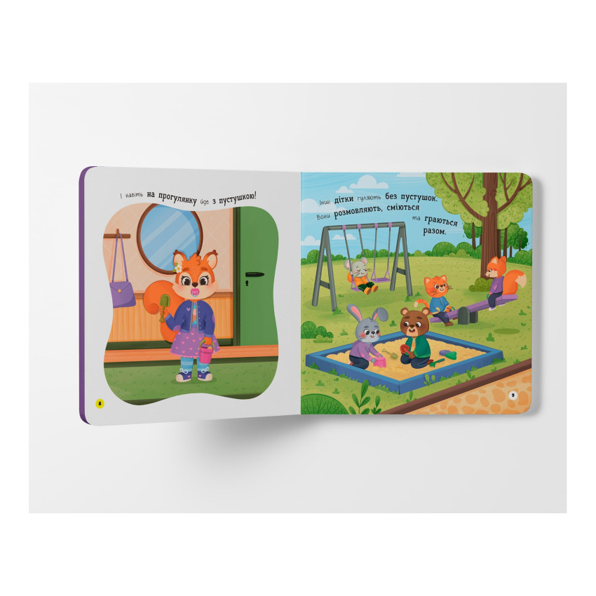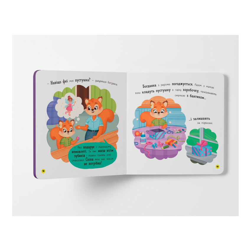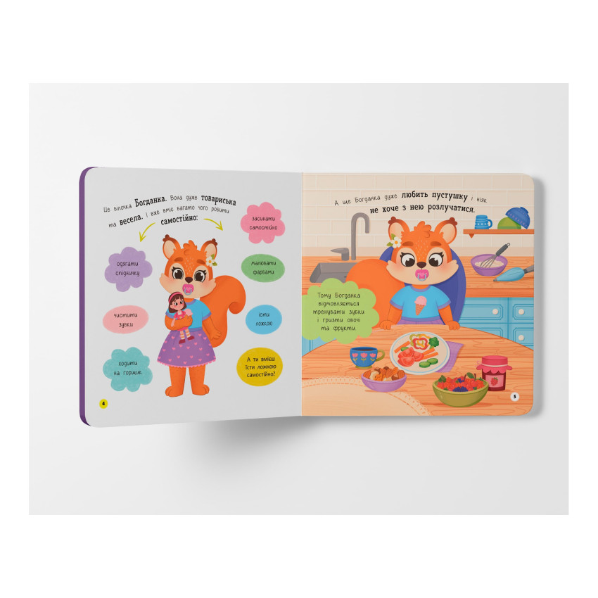 Інтерактивна книжка стане незамінним помічником для батьків, які прагнуть легко й без стресу допомогти дитині попрощатися з пустушкою. Завдяки веселій історії про білочку Богданку, малюк у дружній ігровій формі усвідомить, що без пустушки світ стає яскравішим і цікавішим.